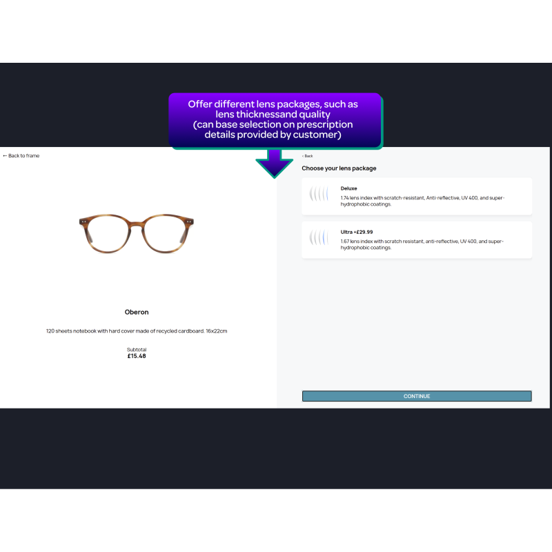 Walk your customers through the entire process of personalizing their prescription glasses, from lens type selection, prescription information and additional customization options - straight from the product page for ultimate convenience.