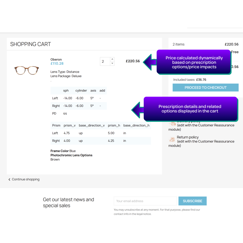 All prescription options selected by the customer for their glasses will appear in the cart, checkout, order emails and also the back office.
